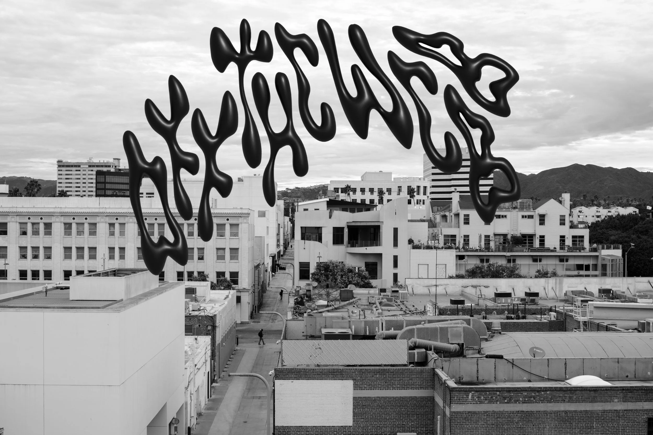 Black graffiti text overlay reading 'Remember to be kind' on a cityscape with buildings and mountains in the background in black and white.